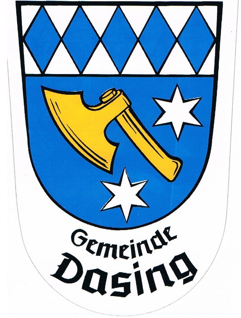 Unter silbernem Schildhaupt, darin nebeneinander fünf senkrechte blaue Rauten, in Blau eine schräge goldene Parte, am Stiel beseitet von je einem sechsstrahligen silbernen Stern. Die Goldene Parte ist das Stammwappen der Massenhauser, die sich in Dasing niederließen. Die blauen Rauten im silbernen Schildhaupt sollen an die Wittelsbacher erinnern. Gleichzeitig symbolisieren die fünf Rauten die fünf Ortsteile: Dasing, Laimering, Rieden, Taiting und Wessiszell.