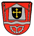 Im oberen Teil des Wappens befindet sich ein silbernes Zelt, darauf ein schwarzes Schild mit goldfarbigem Kleeblattkreuz. Zu beiden Seiten sind lanzenförmige Stangen angeordnet. Darunter ein silberner Wellenbalken und ein halbes Zahnrad.