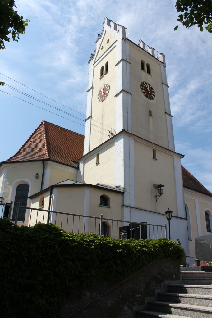 Chor und Turm erste Hälfte 16. Jh., Langhaus 1765 erneuert, festliche Ausstattung 1765, Stuckdekoration in zarten Rokokoformen, Fresken von F. J. Maucher