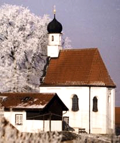 Einschiffiger Bau mit Stichkappentonne und dreiseitigem Schluss. Dachreiter über dem Westgiebel. Ursprünglich romanische Chorturmkirche. Stuck um 1730/35. Das gleicheitige Fresko zeigt Petrus vor Christus kniend, vielleicht von Matthäus Günther. Altar von Hans Sautter, 1658/59. Das Altarbild von Jonas Umbach, 1660, zeigt den hl. Petrus.