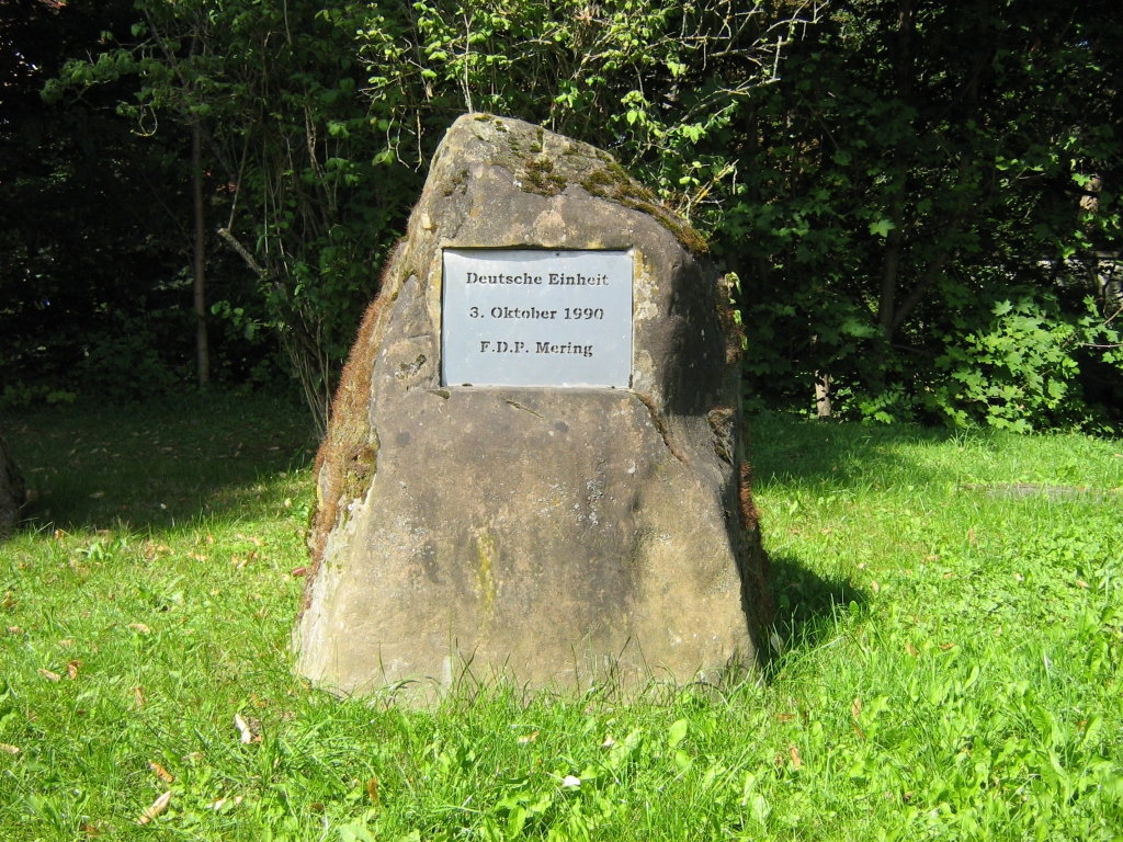 Gedenkstein aus Anlass der deutschen Wiedervereinigung, aufgestellt 1990 vom FDP-Ortsverband Mering in der Grünanlage an der Bouttevillestraße am Nebenarm der Paar zwischen Schloss und der neuen Bibliothek in Mering.