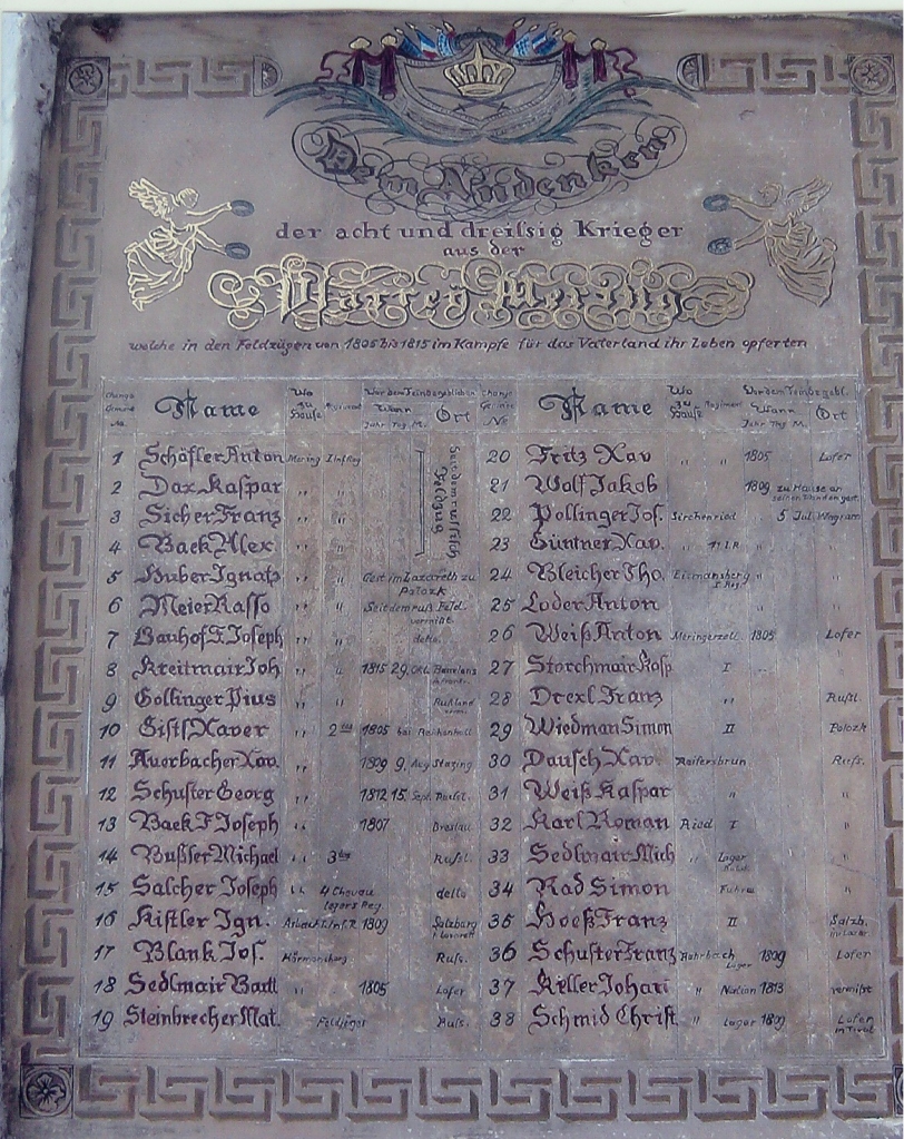 Zum Gedenken an die Gefallenen der Napoleonischen Kriege wurde nach dem Kriegsende (ca. 1820) beim Nordportal der Pfarrkirche eine Tafel angebracht. Die Überschrift lautet: "Dem Andenken der achtunddreißig Krieger aus der Pfarrey Mering, welche in den Feldzügen 1805-1815 im Kampfe für das Vaterland ihr Leben opferten."