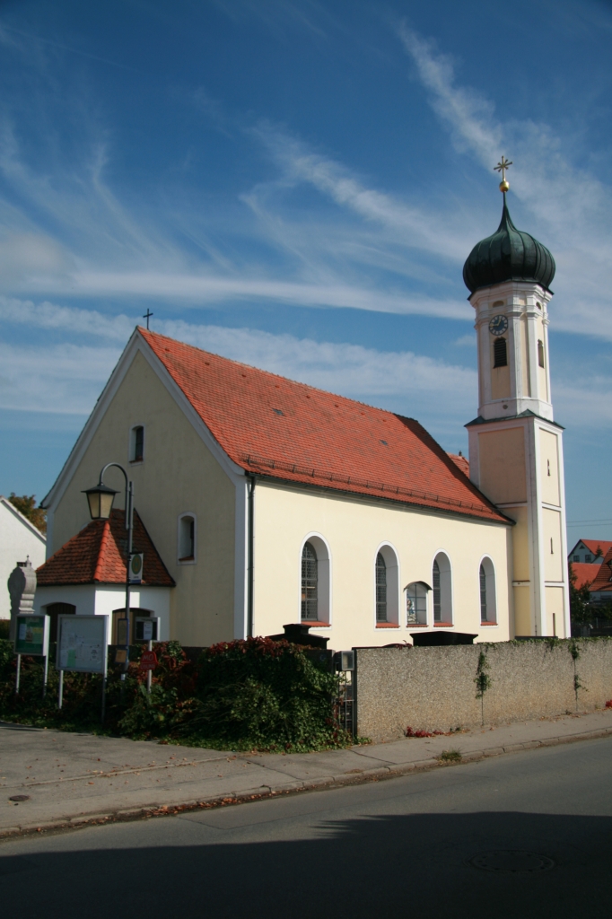 1790 geweiht. Einschiffiger, linsengegliederter Bau, südlich Turm mit spätmittelalterlichen quadratischem Unterbau. Oktogon u. Zwiebelhaube, Langhausfresko; Verurteilung des hl. Georg, Altäre 18.Jh. aus der abgebrochenen Kirche von Nordendorf. Kreuzweg 1760 von Johann Anton Schweinhuber