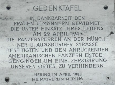 Die Marmortafel mit Inschrift wurde zum 50. Jahrestag (1995) des Kriegsendes und zum Gedenken an die Frauen und Männer, die 1945 für eine kampflose Übergabe des Ortes an die US-Armee gesorgt hatten, vom Heimatverein angebracht. Mering wurde am 29. April 1945 von Teilen der 3. US-Infanterie-Division (7. Inf.Reg.) besetzt.