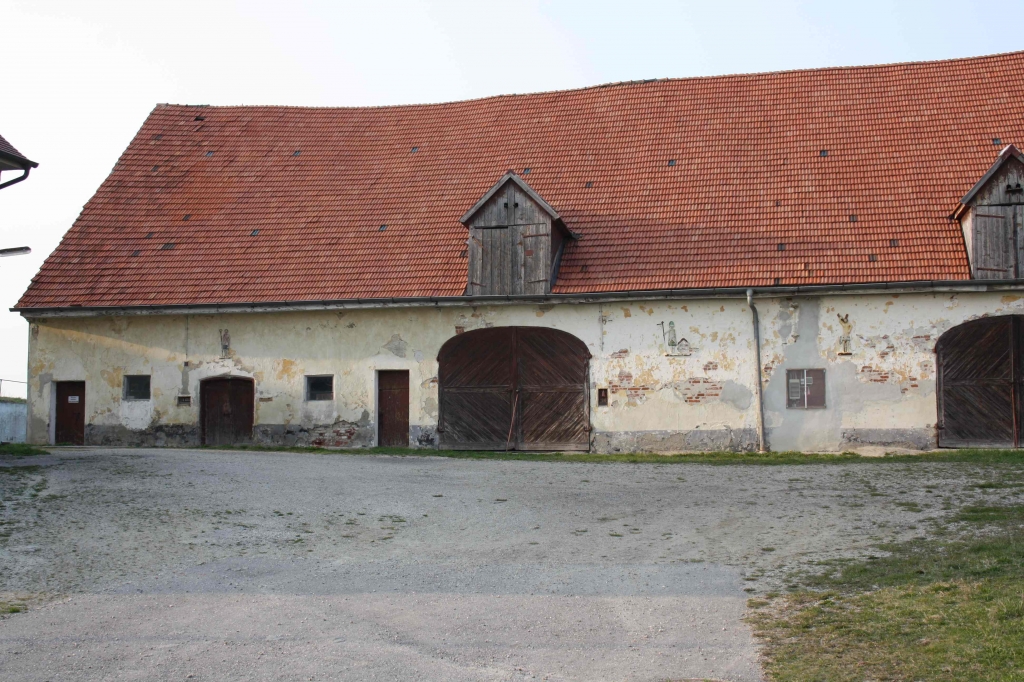 Langgestreckter Satteldachbau mit korbbogigen Toren u. gewölbten Stalleinbauten, hofseitige Mörtelplastiken v. Bartholomäus Ostermair, v. Ende 19. Jh.