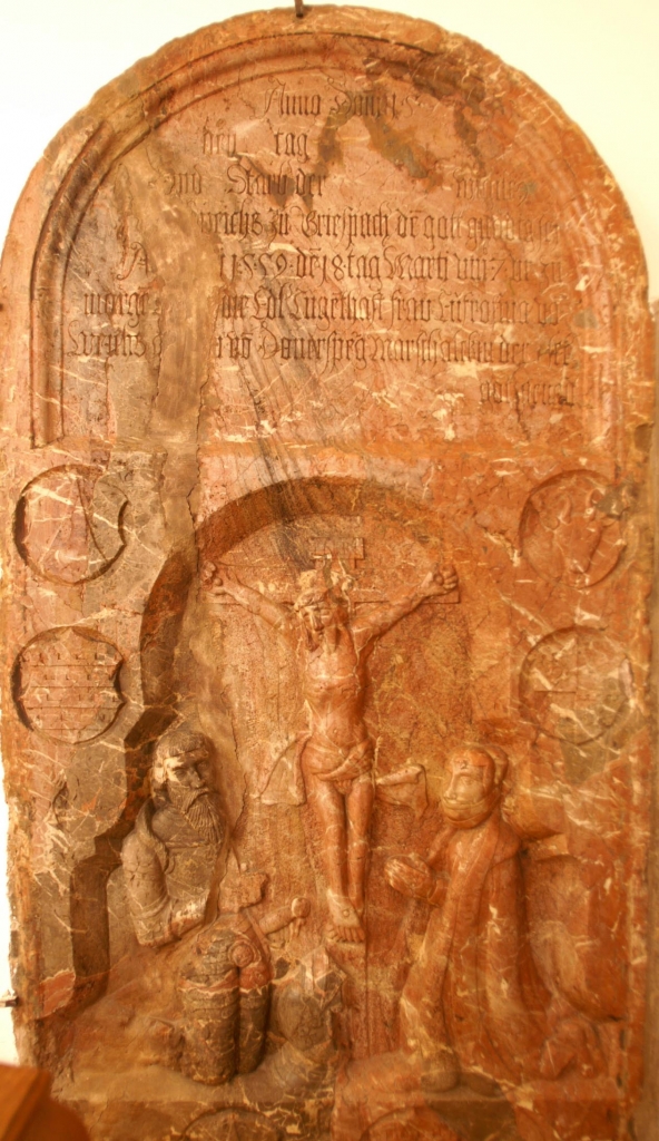 Die Grabplatte für Christoph von Weichs beim Emporenaufgang, Platte aus hellgrauem Sandstein.