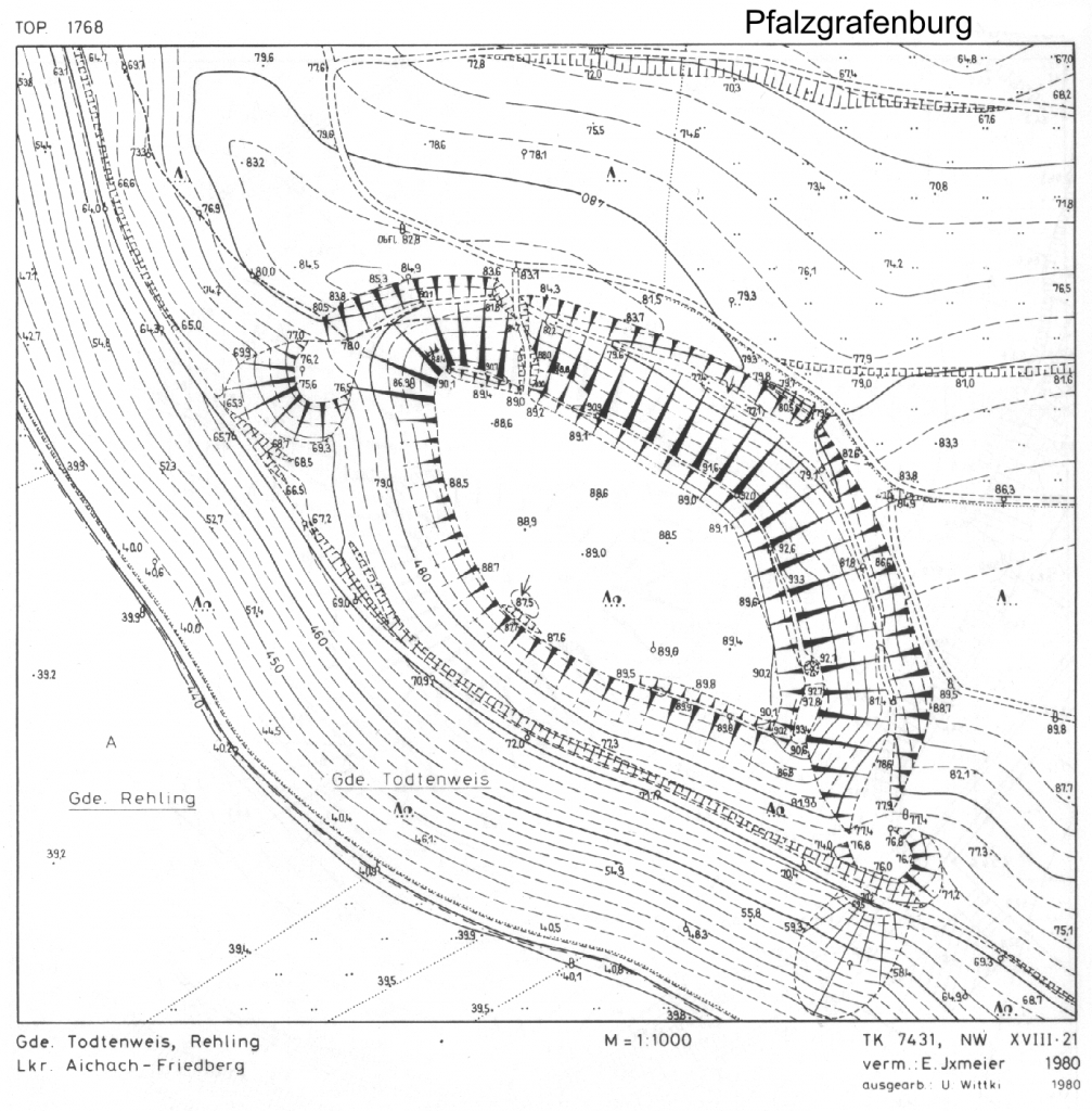 Die Burg lag südwestlich von Todtenweis auf dem Rand der Lechhochterrasse, die nach Südwesten steil abfällt. Die Anlage beschreibt einen spitzovalen Grundriss mit rd. 160 m langem und bis zu 65 m breitem, ebenen Innenraum von 0,957 ha, dessen Hauptachse von Nordwesten nach Südosten weist. Auf der Angriffsseite, im Norden und Osten, wird sie durch einen bogenförmigen, aufgeschütteten Wall gesichert, der stellenweise beschädigt ist, auf der Ostseite mit 2-3 m Innenhöhe seinen stärksten Ausbau erhielt und einst Palisaden trug. Ein dem Wall vorgelegter Graben, den im Nordosten ein Außenwall begleitet, nimmt von Nordwesten nach Südosten an Tiefe zu. Seine Sohle liegt im Nordwesten 7-8 m, im Südosten bis zu 15 m unter der Waldhöhe. Der Graben endet an seinen beiden Enden nach Westen und Süden mit mächtigen Aushubterrassen im Berghang. Die von Norden mittels einer Erdbrücke über den Graben führende Zufahrt ist modern verändert. Etwa in der Mitte der Südwestseite über dem Abhang liegt eine flache, ca. 15 x 20 m große Eintiefung, die den Standort des Wohngebäudes anzeigen dürfte. Zu Beginn des vorigen Jahrhunderts fanden sich dort noch Backsteinreste im Boden. Die östlich der Anlage gelegene Flur heißt seit alters her Burgfeld.